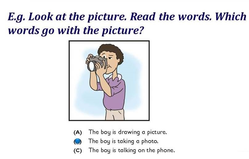 – Phần đọc hiểu: 36 câu hỏi – đánh giá khả năng của học sinh trong việc nhận diện người, vật, hành động, hiểu biển báo, thời biểu, hiểu thư tín cá nhân ngắn (như email…), hiểu câu chuyện ngắn và đơn giản, hiểu văn bản thuộc chủ đề phù hợp với lứa tuổi.