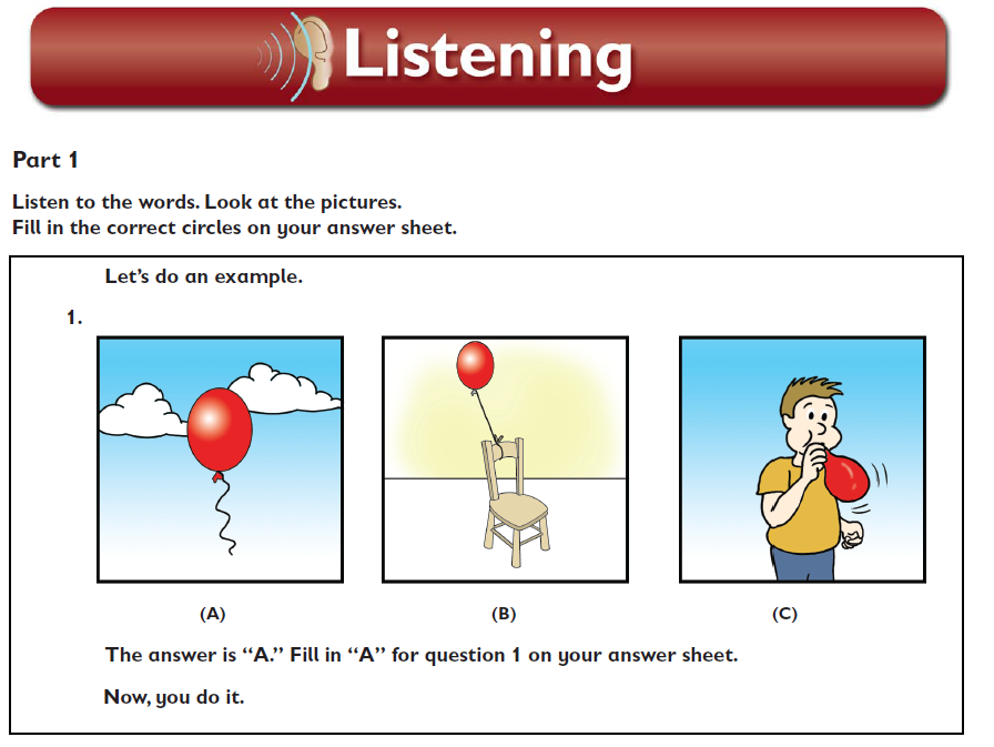 – Phần Nghe hiểu: 36 câu hỏi – đo lường khả năng của học sinh trong việc hiểu những mô tả đơn giản về người và vật, hiểu chỉ dẫn bằng âm thanh (hướng dẫn của giáo viên, …), hiểu đối thoại đơn giản, hiểu câu chuyện kể bằng miệng, hiểu văn bản thông tin ngắn liên quan đến đời sống thường ngày (tin nhắn bằng âm thanh, …), hiểu độc thoại về chủ đề phù hợp với lứa tuổi…
