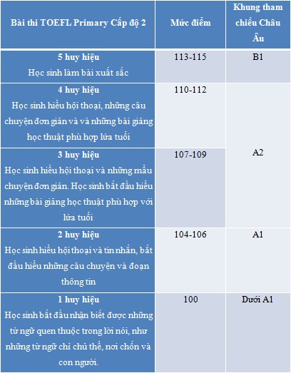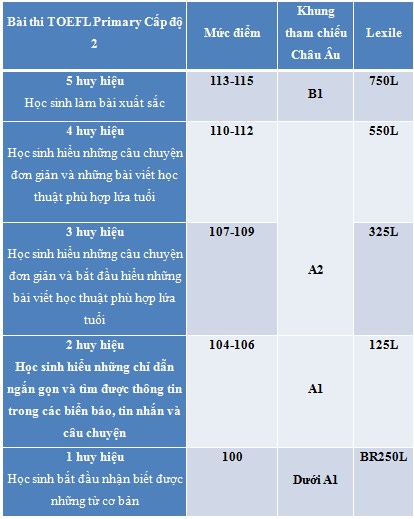 Phiếu điểm là một bản đánh giá toàn diện và chi tiết về năng lực tiếng Anh hiện tại của học sinh. Tùy vào số lượng huy hiệu mà thí sinh đạt được (từ 1-5 huy hiệu), bảng mô tả kết quả của TOEFL Primary cấp độ 2 sẽ đưa ra những khuyến nghị cụ thể về việc học tập tiếp theo. Mức điểm của TOEFL Primary cấp độ 2 có thể dễ dàng quy chiếu sang Khung tham chiếu chung Châu Âu (CEFR).