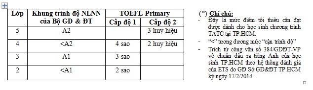 Trong Văn bản số 384 /GDĐT-VP ngày 17/2/2014, Sở Giáo dục & Đào tạo TP.HCM đã ban hành hướng dẫn chi tiết sử dụng thang điểm TOEFL Primary để đánh giá trình độ tiếng Anh cho các lớp tiếng Anh tăng cường và tiếng Anh theo Đề án Ngoại ngữ 2020. Với phiếu điểm TOEFL Primary cấp độ 2, học sinh có thể biết được trình độ tiếng Anh của mình so với mức chuẩn yêu cầu do Sở GD&ĐT TP.HCM quy định. Cụ thể: học sinh học hết lớp 4 Tiếng Anh tăng cường (TATC) cần đạt tối thiểu 2 huy hiệu của bài thi TOEFL Primary cấp độ 2, học sinh học hết lớp 5 TATC cần đạt tối thiểu 3 huy hiệu của bài thi TOEFL Primary cấp độ 2.