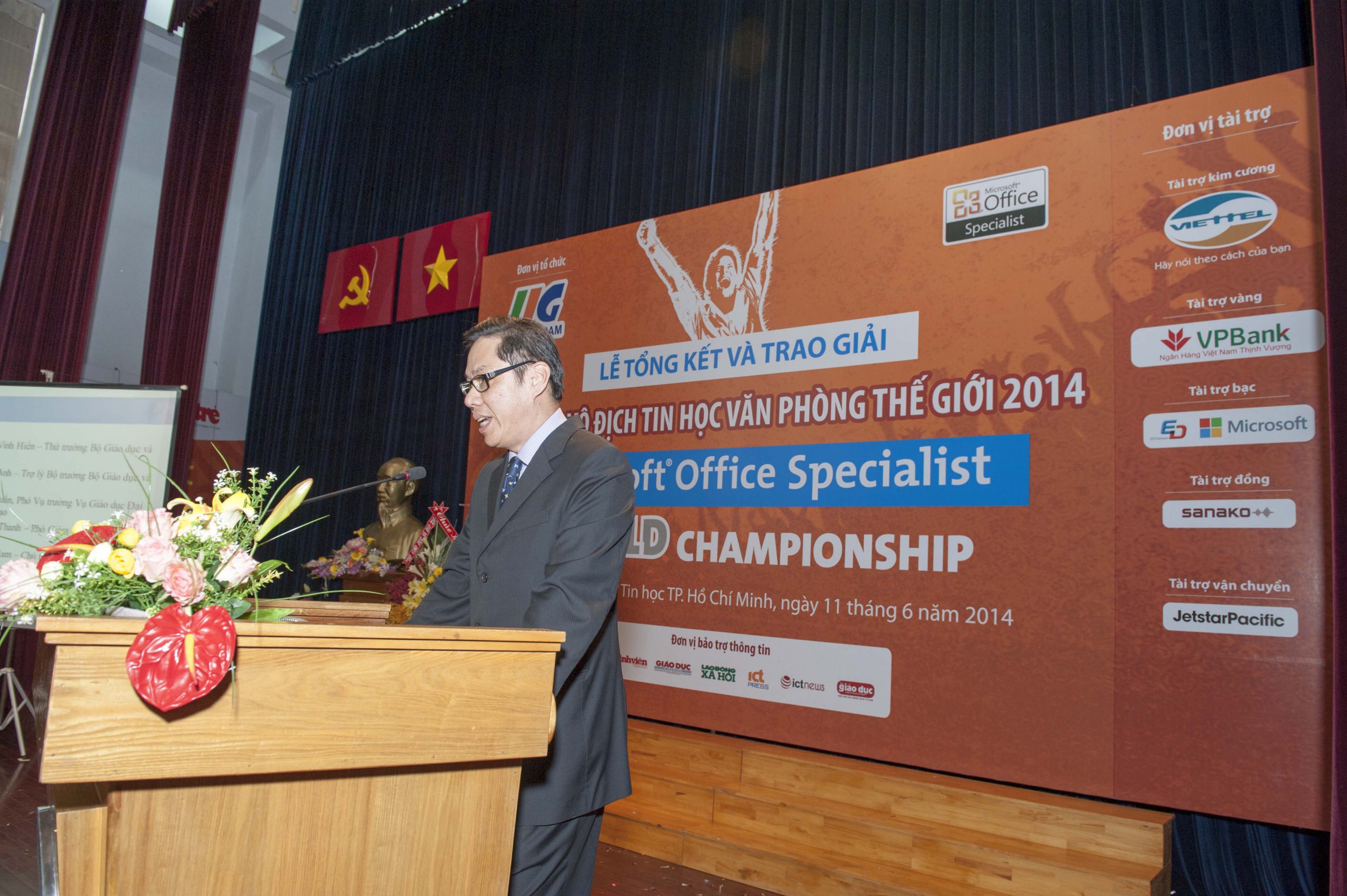 Ông Nguyễn Vinh Hiển (Thứ trưởng Bộ GD&ĐT) phát biểu tại Lễ tổng kết và trao giải cuộc thi MOSWC 2014