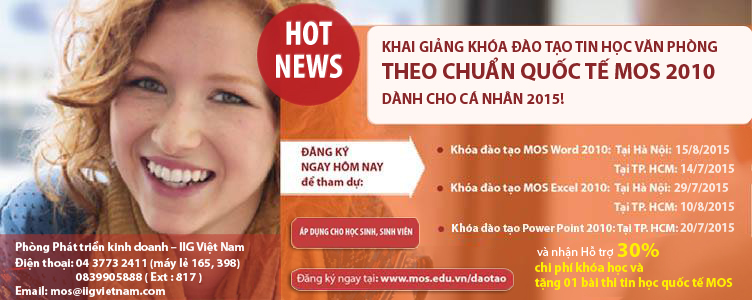 Nhân dịp chào hè 2015, Khóa đào tạo MOS dành cho cá nhân tại Hà Nội và TP. Hồ Chí Minh, IIG Việt Nam dành tặng chương trình ưu đãi đặc biệt hỗ trợ 30% chi phí khóa học và tặng 1 bài thi quốc tế MOS dành cho các học sinh , sinh viên khi đến đăng ký Khóa học.