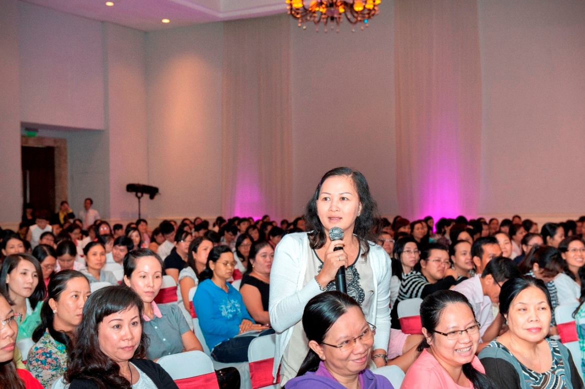 Thể hiện tinh thần đó, Hội thảo Dạy và học tiếng Anh tiểu học tại TP.HCM mang tới cho cử tọa tham gia một số bài tham luận rất hữu ích của chính các giáo viên tiếng Anh tiểu học. Thông qua bài tham luận, các giáo viên chia sẻ với đồng nghiệp thành phố những thông tin và kinh nghiệm sẵn có đúc kết từ thực tế giảng dạy tiếng Anh của bản thân, với các chủ đề như « Giảng dạy tiếng Anh qua toán và khoa học – Cuộc du ngoạn của giọt nước » (Cô Nguyễn Hoàng Diễm Trang – GV Trường TiH Nguyễn Trường Tộ, Q4), « Giảng dạy tiếng Anh qua văn hóa Việt Nam » (Cô Nguyễn Thị Ánh Tuyết- GV Trường TiH Lạc Long Quân, Q.11), « Giảng dạy tiếng Anh qua các hoạt động kể và đọc truyện» (Cô Đỗ Thị Thanh Thúy, GV Trường TiH Xuân Thới Thượng, Hóc Môn). Thông tin chia sẻ giữa các giáo viên là nguồn tài nguyên chung quý giá góp phần kích thích sự hứng thú, quan tâm của trẻ với bài học tiếng Anh, tăng cường sự chủ động của trẻ trong lớp học và giúp trẻ tiếp thu bài học tốt hơn.