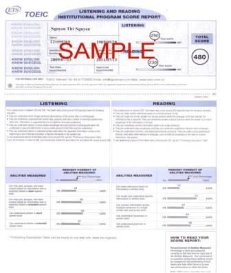 Dưới đây là một ví dụ về phiếu điểm TOEIC mới (Re-Designed) bắt đầu được áp dụng từ ngày 1/1/2010 tại Việt Nam