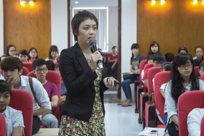 Ngoài hoạt động ký kết, Lễ Công bố Chuẩn Ngoại ngữ và Tin học còn dành thời lượng đáng kể để các chuyên gia IIG Việt Nam giới thiệu chi tiết với các sinh viên Khóa 5 những thông tin chi tiết về bài thi tiếng Anh TOEIC và các bài thi tin học IC3, MOS (cấu trúc bài thi, các dạng câu hỏi, phương thức đánh giá, độ phổ cập, lợi ích của các bài thi này đối với sinh viên…). Buổi lễ cũng có sự tham dự của Bà Lê Thu Vân – Trưởng Phòng, Trung tâm Nhân sự Tổng hợp, Khối Quản trị Nguồn nhân lực, Ngân hàng Việt Nam Thịnh vượng (VPBank) với các chia sẻ từ góc nhìn nhà tuyển dụng về tầm quan trọng của tiếng Anh và Tin học trong công tác tuyển dụng, đánh giá và bố trí nhân sự trong các tổ chức. Bà Lê Thu Vân cũng đưa ra các tiêu chuẩn chi tiết về TOEIC và IC3/MOS đang được áp dụng tại VPBank, cho các đối tượng từ nhân viên mới, chuyên viên tới cán bộ quản lý của ngân hàng.