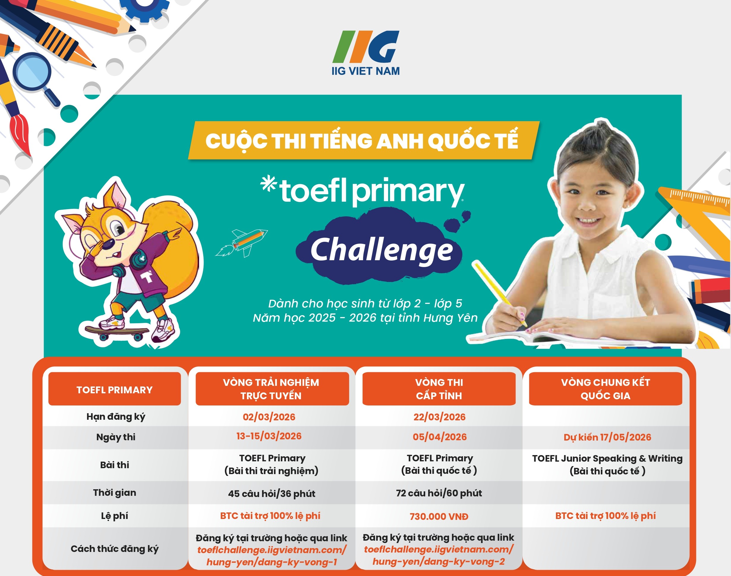 Tổ chức Giáo dục IIG Việt Nam – Đại diện Quốc gia của Viện Khảo thí Giáo dục Hoa Kỳ (ETS) phát động cuộc thi tiếng Anh quốc tế TOEFL Challenge năm học 2025-2026 dành cho học sinh từ lớp 2-9 trên toàn tỉnh.