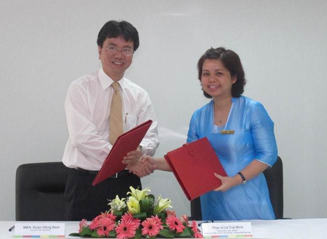 Ông Đoàn Hồng Nam – Chủ tịch IIG Việt Nam và Bà Lê Tuệ Minh – Chủ tịch Hội đồng Điều hành Hệ thống trường Wellspring Hà Nội ký kết biên bản ghi nhớ