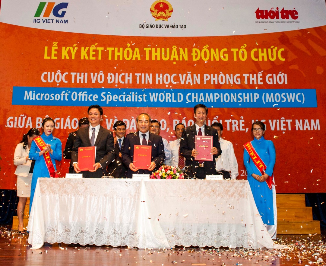 The Signing Ceremony of the MOU among the Ministry of Education and Training, Tuoi Tre Newspaper and IIG Vietnam on cooperation to co-organize the MOSWC for Vietnamese students within 5 years starting from 2015 took place, opening the MOSWC 2014 Award Ceremony in HCM City. The collaboration has marked a milestone in the 5-year development of the MOSWC in Vietnam, which has brought about considerable social significance. The MOSWC has created a healthy and practical playground for the youth of Vietnam and encouraged Vietnamese students to study and enhance their IT proficiency, which would, in turn, help to raise Vietnam’s workforce efficiency in the global economy. With the competition, Vietnamese students has gained access to international assessments of Microsoft office skills, thus, enhancing their IT literacy up to international standards. In addition, the competition has also selected the best candidates in each category representing Vietnam at the World Championship in the U.S.