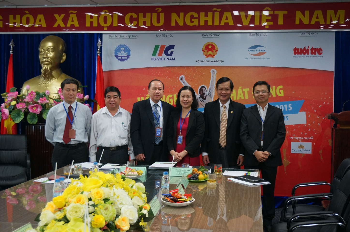 Đại biểu tham dự Hội thảo phát động MOSWC 2015 tại tỉnh Bình Dương chụp ảnh lưu niệm: (Từ trái qua phải) Đại diện Sở GD&ĐT Bình Dương, Ông Mai Long Nguyên Nguyên – Phó Trưởng phòng Giáo dục Trung học – Sở GD&ĐT Bình Dương, Ông Hà Hữu Phúc – Vụ trưởng, Giám đốc Cơ quan đại diện Bộ GD&ĐT tại Tp.HCM, Bà Vũ Bích Ngọc – Giám đốc IIG Việt Nam Chi nhánh Tp.HCM, Ông Lê Nhật Nam – Phó Giám đốc Sở GD&ĐT Bình Dương, Ông Trần Anh Tuấn – Phó giám đốc Viettel chi nhánh Bình Dương