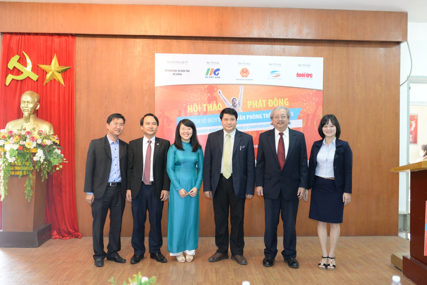 Đại biểu tham dự Hội thảo phát động MOSWC 2015 tại Đà Nẵng chụp ảnh lưu niệm: (Từ trái qua) Ông Nguyễn Anh Kha – Phó Giám đốc Dịch vụ Giải pháp – Chi nhánh Viettel Đà Nẵng, Ông Nguyễn Đình Vĩnh – Phó Giám đốc Sở Giáo dục và Đào tạo Đà Nẵng, MC chương trình, Ông Đoàn Văn Ninh – Phó Vụ trưởng Vụ Giáo dục Trung học – Bộ Giáo dục và Đào tạo, Ông Tôn Thất Duy – Giám đốc IIG Việt Nam Chi nhánh Đà Nẵng, Bà Phạm Thị Khánh Phượng – Chuyên gia IIG Vietnam