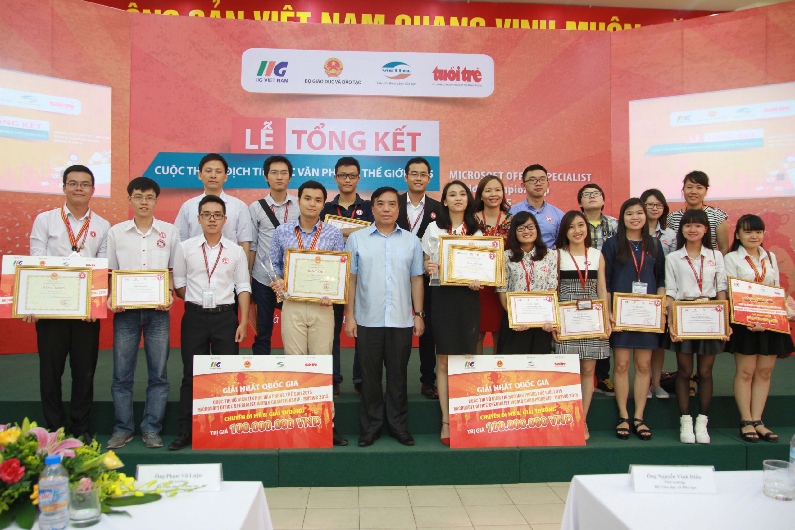 Chủ tịch IIG Việt Nam Đoàn Hồng Nam, Bộ trưởng Bộ GD & ĐT Phạm Vũ Luận, Phó TGĐ Viettel và Tổng Biên Tập báo Tuổi Trẻ trao giải cho 3 nhà vô địch MOSWC 2015 tại Việt Nam