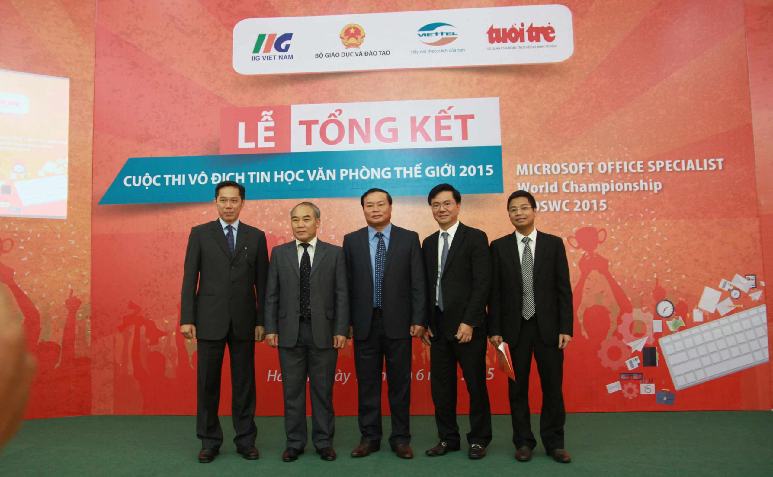 Lễ Tổng kết Cuộc thi Vô địch Tin học Văn phòng Thế giới 2015 đã diễn ra thành công tốt đẹp, đánh dấu bước chuyển mình mới của cuộc thi MOSWC tại Việt Nam. Ảnh: Ban Tổ chức chụp ảnh kỷ niệm trên sân khấu  từ trái qua: Ông Moses Wan – Phó Chủ tịch Certiport; Ông Nguyễn Vinh Hiển – Thứ trưởng Bộ GD&ĐT; Ông Hoàng Công Vĩnh – Phó TGĐ Viettel; Ông Đoàn Hồng Nam – Chủ tịch IIG Việt Nam và Ông Phùng Văn Cường – Phó TGĐ Tổng công ty viễn thông Viettel