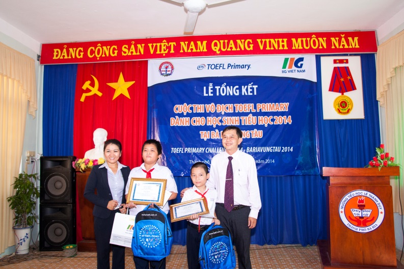 Nguyễn Đức Mạnh (học sinh lớp 4 trường Tiểu học Hạ Long) và Vũ Tấn Khang (học sinh lớp 5 trường Tiểu học Cao Văn Ngọc) giành giải Nhất cuộc thi Vô địch TOEFL Primary 2014 tại Bà Rịa – Vũng Tàu (Lễ tổng kết ngày 21/5/2014)