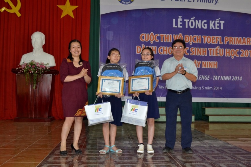 Đặng Ngọc Anh (học sinh lớp 5 trường Tiểu học Võ Thị Sáu và Nguyễn Hoàng Hân (học sinh lớp 5 trường Tiểu học Thị Trấn B) giành giải Nhất cuộc thi Vô địch TOEFL Primary 2014 tại Tây Ninh (Lễ tổng kết ngày 22/5/2014)