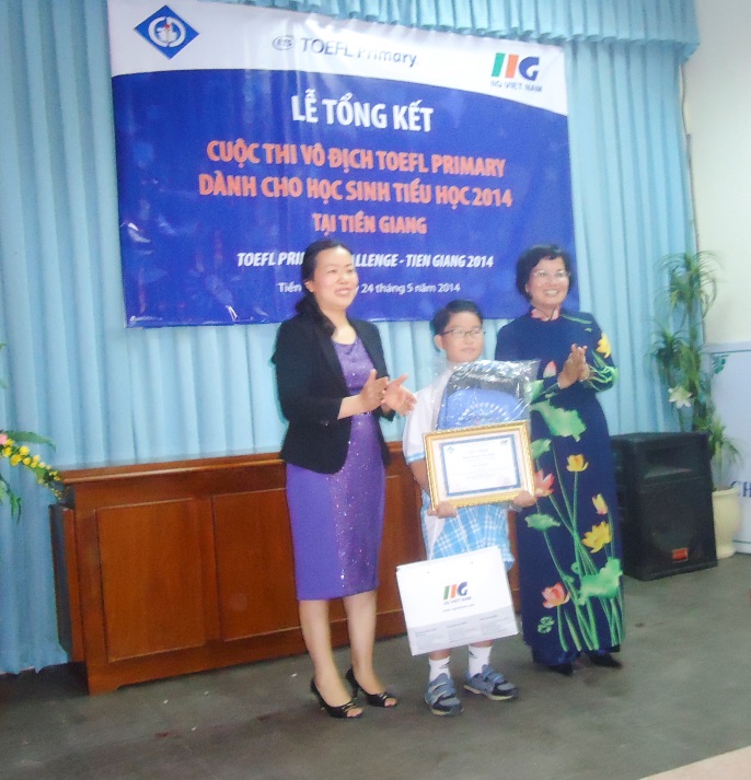 Võ Thịnh Vượng, học sinh lớp 4 trường Tiểu học Thị trấn Mỹ Tho 1 giành giải Nhất cuộc thi Vô địch TOEFL Primary 2014 tại Đồng Tháp (Lễ tổng kết ngày 23/5/2014)