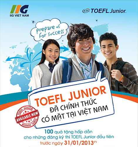 Bài thi TOEFL Junior đã chính thức được giới thiệu tại Việt Nam. Nhân sự kiện quan trọng này, Công ty IIG Việt Nam sẽ dành tặng 100 phần quà hấp dẫn dành cho các thí sinh THCS trên toàn quốc khi đăng ký thi TOEFL Junior trước ngày 31/1/2013