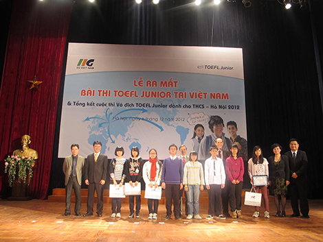 “Lễ ra mắt bài thi TOEFL Junior tại Việt Nam” ngày 6/12 vừa qua với sự có mặt của Đại diện Bộ GD & ĐT; đại diện của Viện Khảo thí Giáo dục Hoa Kỳ (ETS) cùng đại diện của Phòng Giáo dục các quận huyện và phụ huynh, học sinh THCS tại Hà Nội đã trở thành một dấu mốc quan trọng trong việc đánh giá trình độ tiếng Anh của các em bậc THCS. Tại buổi lễ, 12 gương mặt xuất sắc của cuộc thi Vô địch TOEFL Junior dành cho THCS- Hà Nội 2012 cũng đã được vinh danh; các vị khách tham gia chương trình cũng đã có dịp giao lưu nhiều hơn với quán quân của cuộc thi – thí sinh Nguyễn Hoàng Long, học sinh trường Đoàn Thị Điểm – thí sinh ưu tú nhất vượt qua hơn 1.400 học sinh giỏi tiếng Anh đến từ hơn 80 trường THCS trên địa bàn Tp.Hà Nội. Em Long có chia sẻ: “Em rất mong cuộc thi sẽ được tổ chức hàng năm và được phổ biến rộng trên toàn quốc để các bạn đồng trang lứa như em đều có cơ hội tiếp xúc với bài thi quốc tế TOEFL Junior”