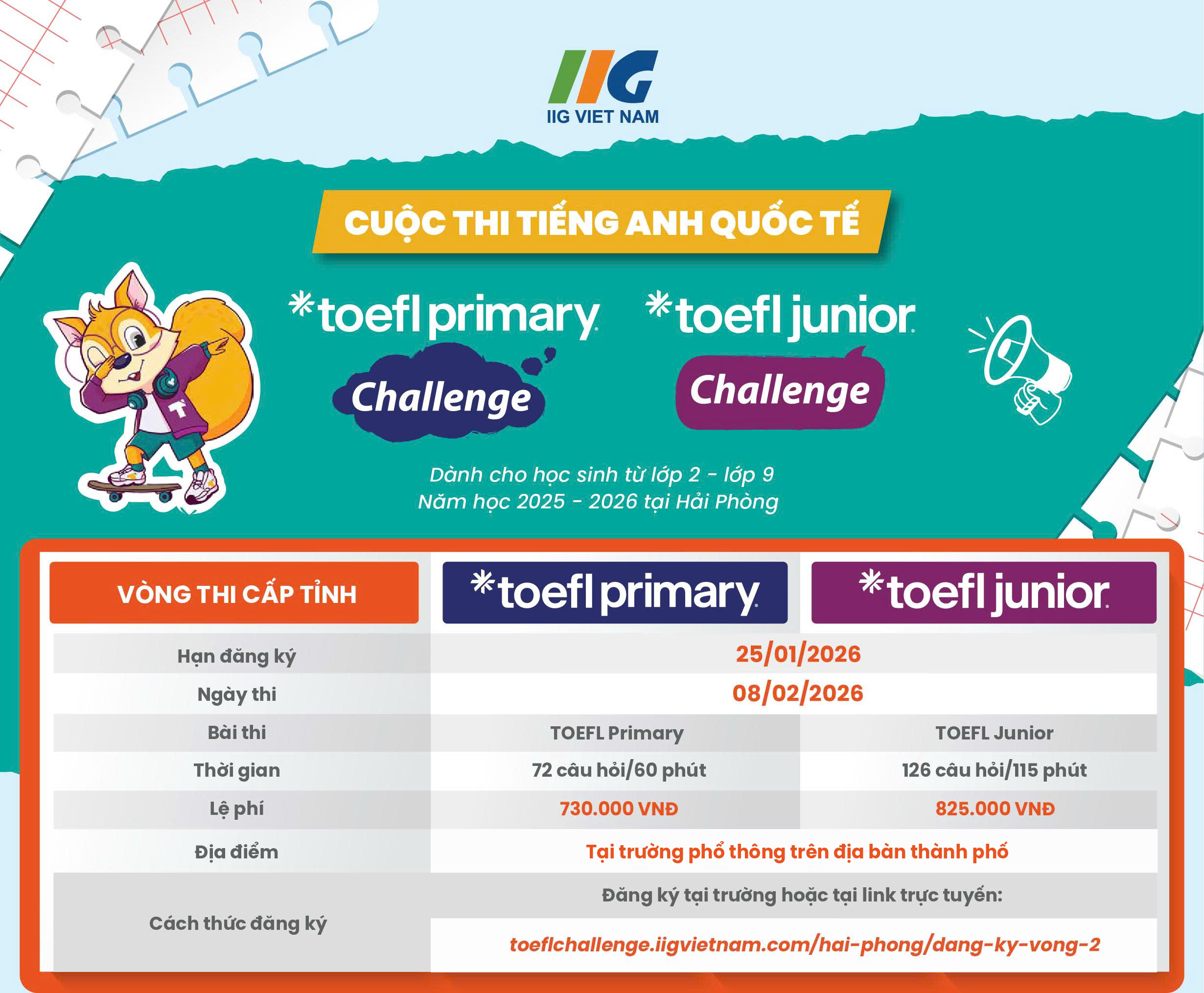 Vòng thi Cấp Thành phố – cuộc thi tiếng Anh quốc tế TOEFL Challenge 2025–2026 mở ra sân chơi tiếng Anh để học sinh tại thành phố Hải Phòng từ lớp 2 đến lớp 9 tham gia tranh tài, bứt phá và khẳng định năng lực tiếng Anh theo thước đo quốc tế.