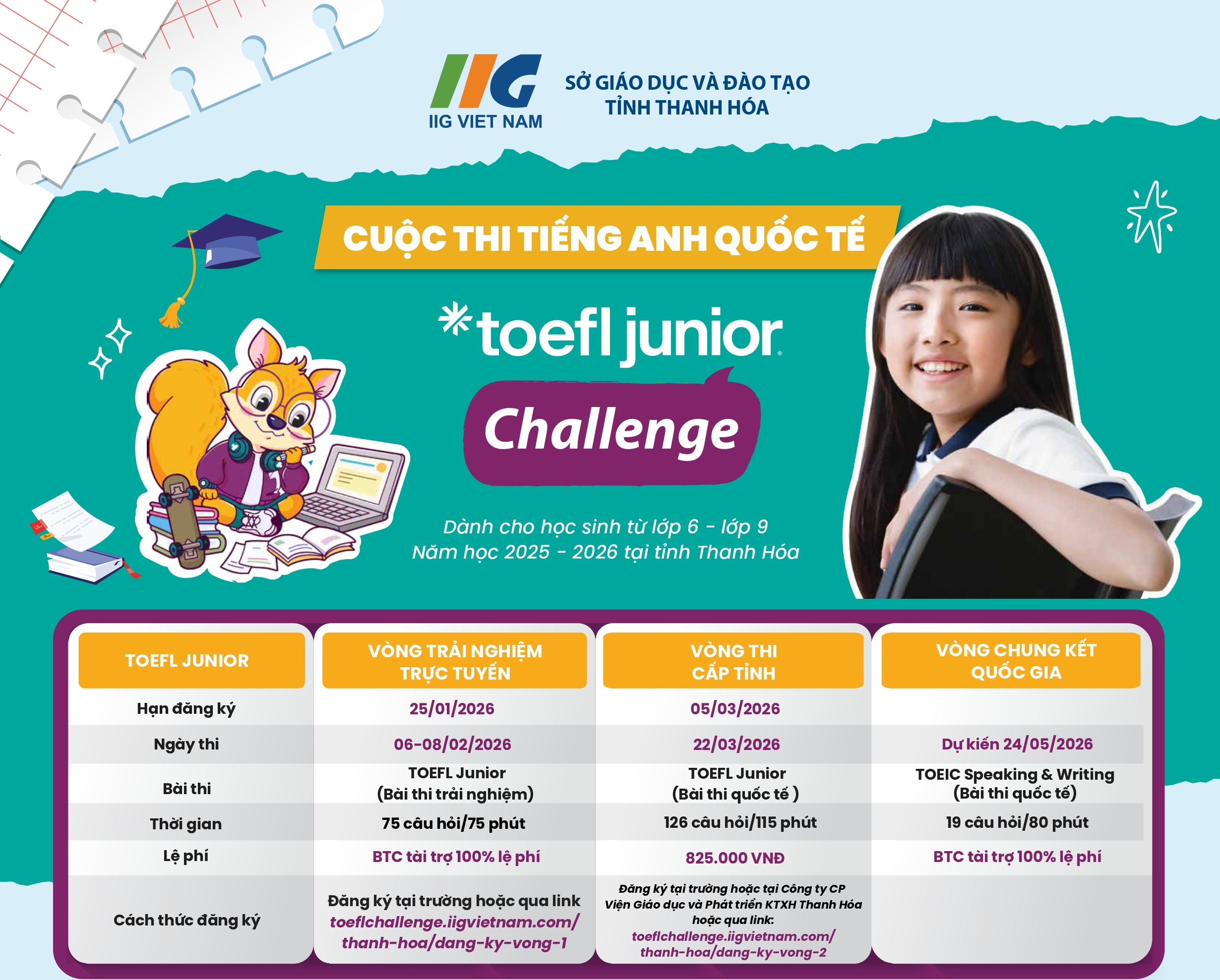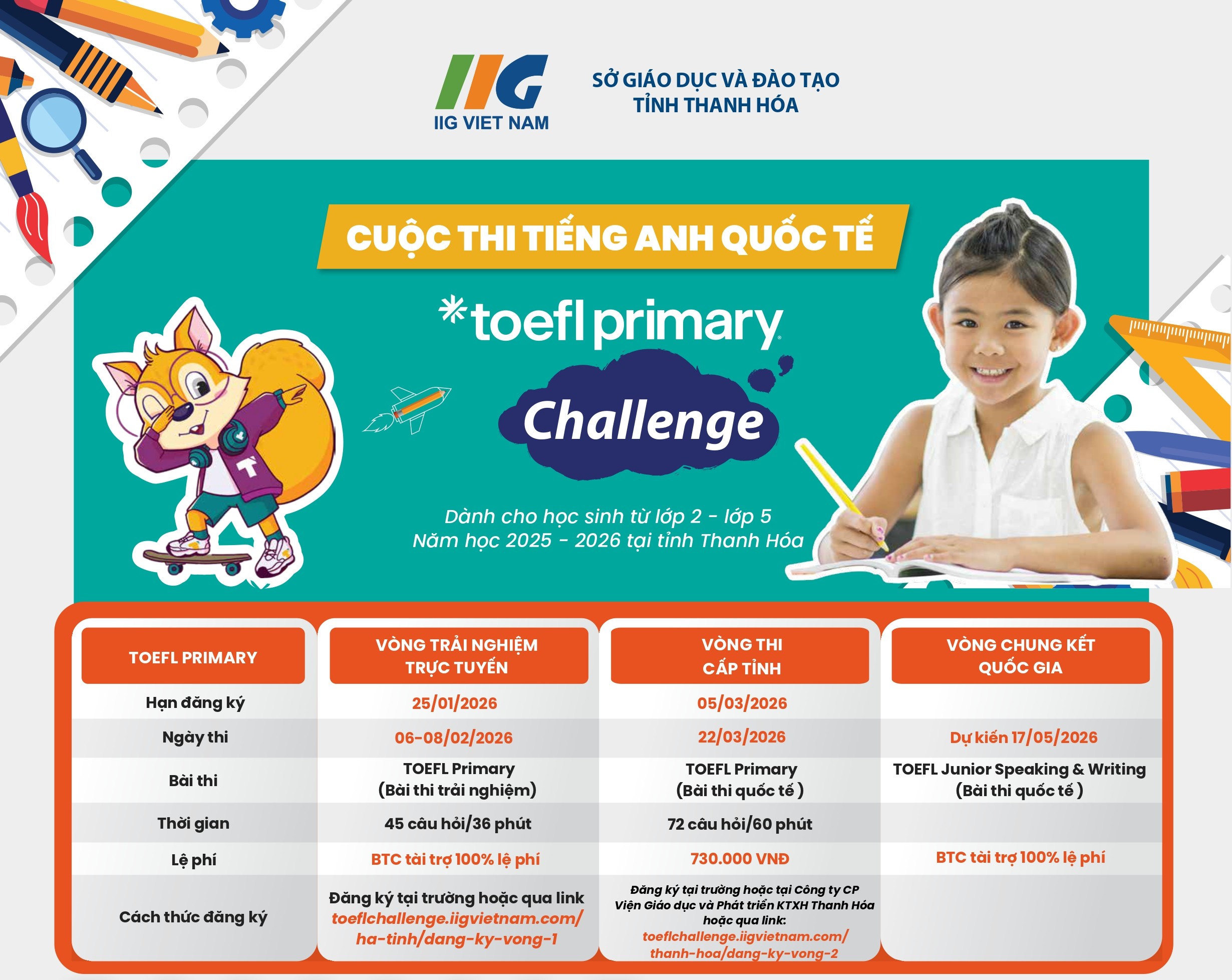 Tổ chức Giáo dục IIG Việt Nam – Đại diện Quốc gia của Viện Khảo thí Giáo dục Hoa Kỳ (ETS) và Sở GD&ĐT tỉnh Thanh Hóa chính thức phát động cuộc thi tiếng Anh quốc tế TOEFL Challenge mùa giải mới năm học 2025-2026 tại tỉnh Thanh Hóa dành cho học sinh từ lớp 2-9 trên toàn tỉnh.