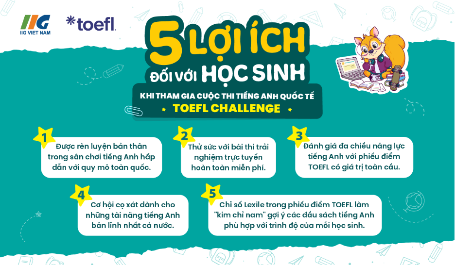 TOEFL Challenge là cuộc thi tiếng Anh quốc tế uy tín được Tổ chức Giáo dục IIG Việt Nam tổ chức thường niên với quy mô toàn quốc, được đông đảo phụ huynh và học sinh quan tâm. Không chỉ là sân chơi tiếng Anh quốc tế, mỗi thí sinh đều có cơ hội được cọ xát năng lực đánh giá các kỹ năng tiếng Anh theo chuẩn quốc tế, sẵn sàng chinh phục các mục tiêu học tập với nhiều giá trị thiết thực: