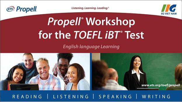 Trong bối cảnh đó, có một giải pháp giúp giáo viên luyện thi xây dựng hình ảnh và uy tín nghề nghiệp để trở nên nổi bật so với các đồng nghiệp khác. Đồng thời, giải pháp này khiến học sinh có thể dễ dàng tiếp cận và lựa chọn được giáo viên luyện thi hiệu quả, nhằm đạt được mục đích sau cùng là điểm số TOEFL iBT mong muốn. Giải pháp được cung cấp bởi chính Viện Khảo thí Giáo dục Hoa Kỳ (ETS) – tổ chức nghiên cứu và phát triển bài thi TOEFL iBT. Thông qua đại diện chính thức và duy nhất của mình tại Việt Nam – IIG Việt Nam, ETS cung cấp khóa tập huấn “Xây dựng chương trình và luyện thi TOEFL iBT” (Propell Workshop for the TOEFL iBT test) dành cho các giáo viên mong muốn tiếp cận sâu và rèn luyện phương pháp giảng dạy định hướng TOEFL iBT. Chủ trì và hướng dẫn Khóa tập huấn là các chuyên gia cao cấp (Master Trainer) về TOEFL iBT do ETS trực tiếp đào tạo và công nhận.