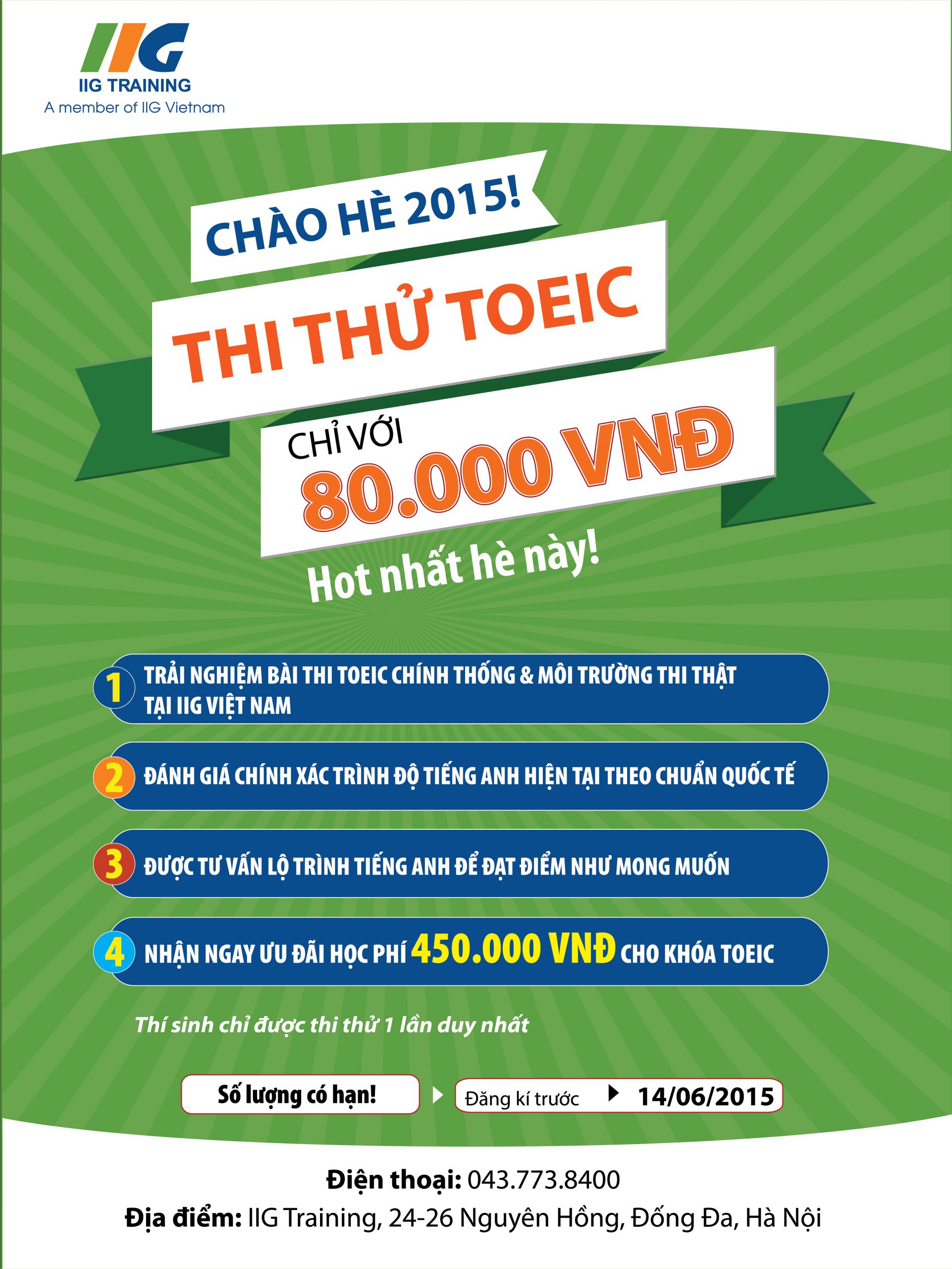 Với mong muốn giúp các thí sinh thi TOEIC, những người đang và sẽ học TOEIC có cơ hội tiếp cận bài thi TOEIC chính thống của Viện Khảo Thí Giáo Dục Hoa Kỳ (ETS), lần đầu tiên IIG Training (Trung tâm đào tạo của IIG Việt Nam- Đơn vị độc quyền cung cấp và tổ chức thi TOEIC tại Việt Nam) triển khai chương trình THI THỬ TOEIC với mức giá ưu đãi.