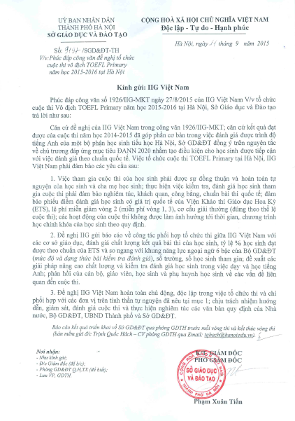 Thông báo v/v Sở GD&ĐT Hà Nội đồng ý tổ chức TOEFL Primary Challenge