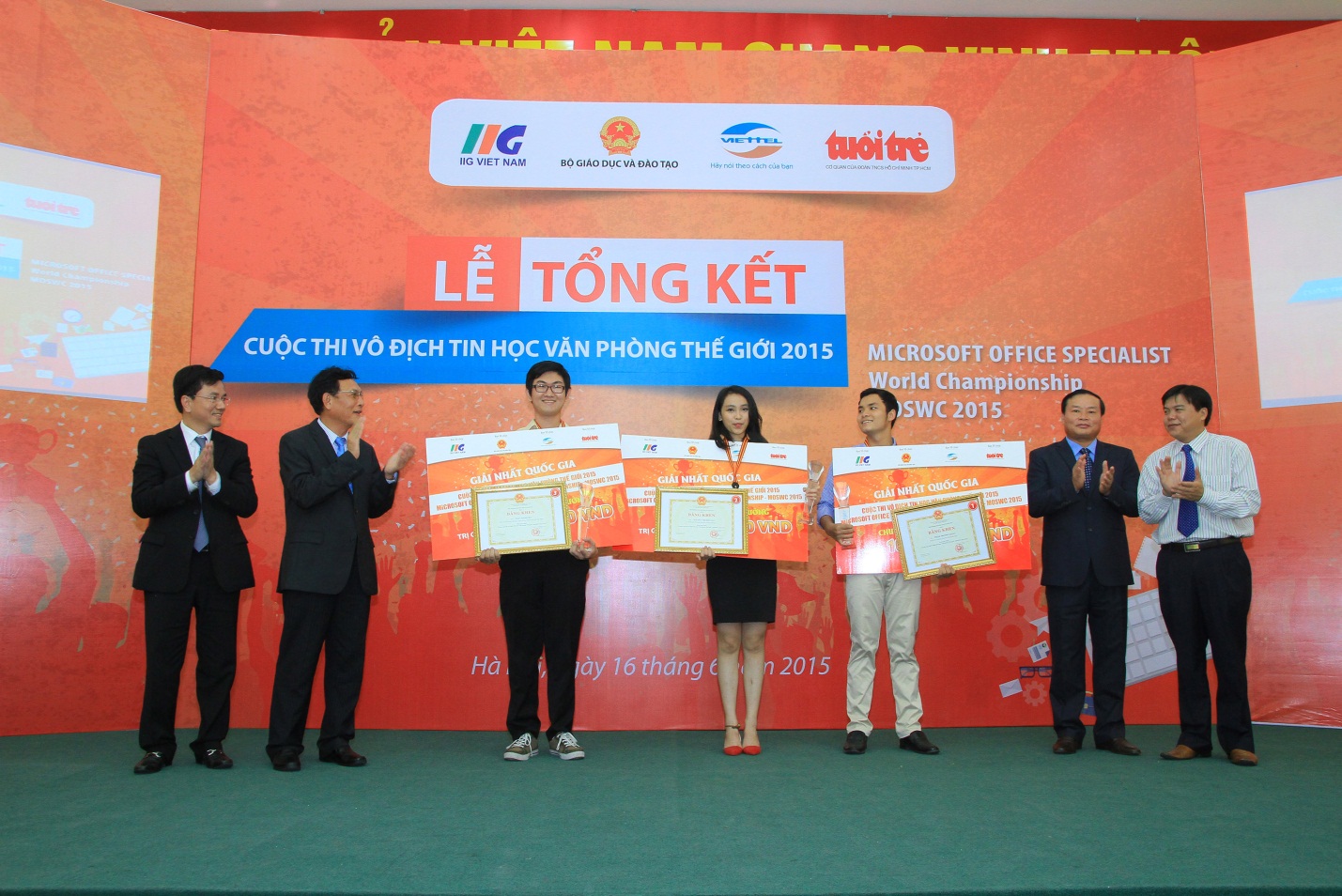 Chủ tịch IIG Việt Nam Đoàn Hồng Nam, Bộ trưởng Bộ GD & ĐT Phạm Vũ Luận, Phó TGĐ Viettel Hoàng Công Vĩnh và Tổng Biên Tập báo Tuổi Trẻ Tăng Hữu Phong trao giải cho 3 nhà vô địch MOSWC 2015 tại Việt Nam