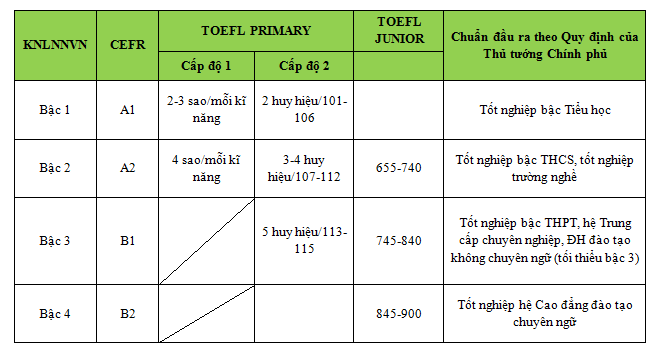 TOEFL Junior đặc biệt được Bộ Giáo dục & Đào tạo công nhận là tiêu chuẩn về năng lực ngoại ngữ đầu vào của học sinh THCS và THPT (Tại công văn số 2653.BGDĐT-GDTrH ngày 23/05/2014 về hướng dẫn triển khai dạy học tiếng Anh cấp THCS và THPT). Dựa trên kết quả TOEFL Junior, phụ huynh cũng có thể đánh giá được trình độ của con em mình theo Khung tham chiếu năng lực ngoại ngữ của châu Âu (CEFR) và Khung năng lực ngoại ngữ 6 bậc dùng cho Việt Nam với bảng quy đổi bên dưới.