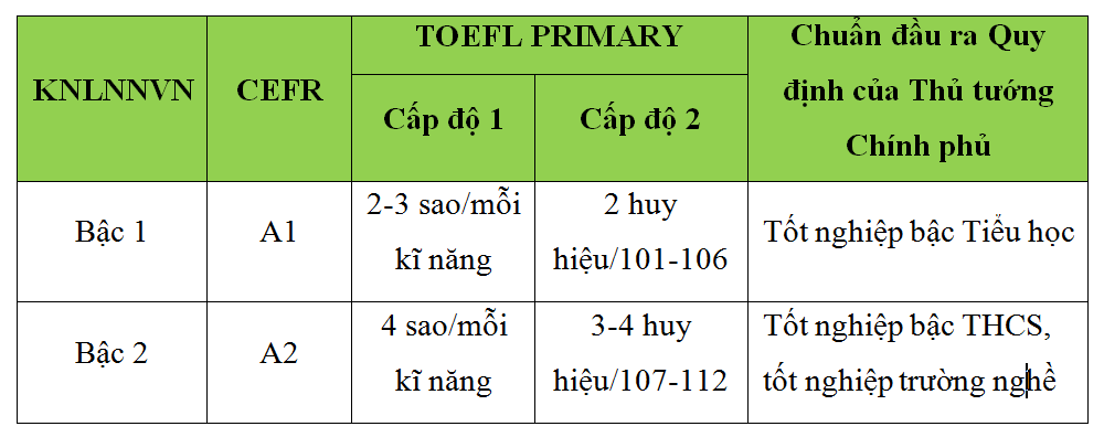 Năm 2014, Khung năng lực ngoại ngữ Việt Nam (KNLNNVN) chính thức được ban hành. Cũng trong năm này, bài thi TOEFL Primary đã chính thức được Bộ GD&ĐT công nhận các mức trình độ cụ thể tương ứng với Khung năng lực ngoại ngữ Việt Nam (KNLNNVN) và Khung tham chiếu chung châu Âu (CEFR) (theo CV 1849/KTKĐCLGD-KĐĐH – Bộ GD&ĐT).