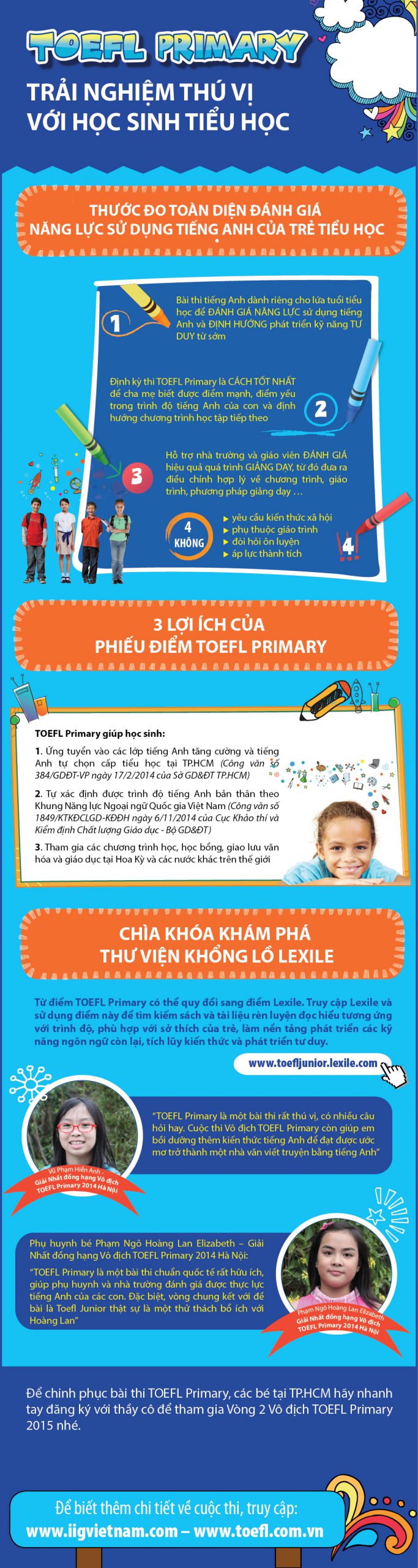 Học sinh tiểu học TPHCM đang háo hức chuẩn bị bước vào Vòng 2 Cuộc thi Vô địch TOEFL Primary 2015 để thử sức với bài thi TOEFL Primary của Viện Khảo thí Giáo dục Hoa Kỳ (ETS). Cùng tìm hiểu tại sao bài thi TOEFL Primary và Cuộc thi Vô địch TOEFL Primary được mong đợi như vậy nhé.