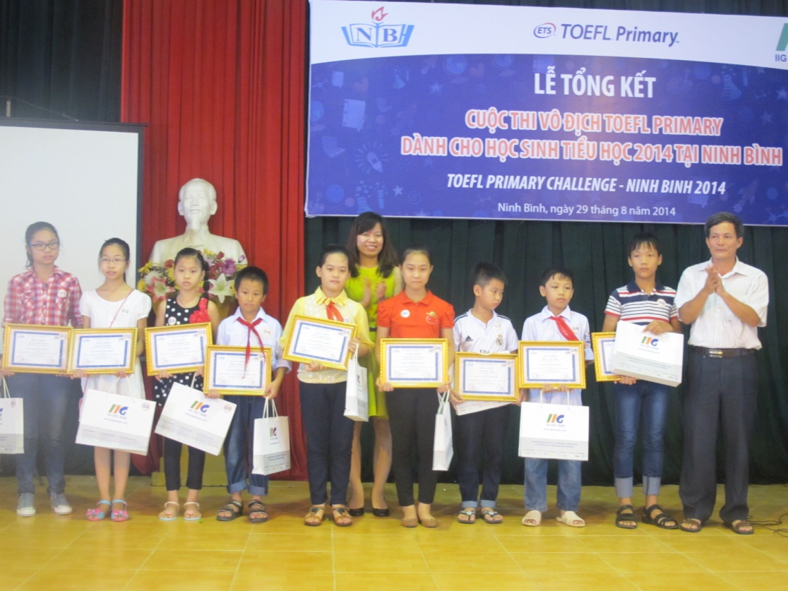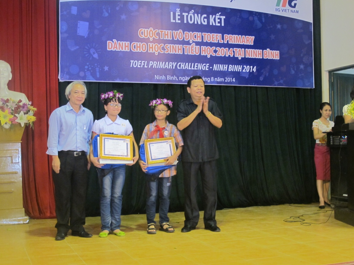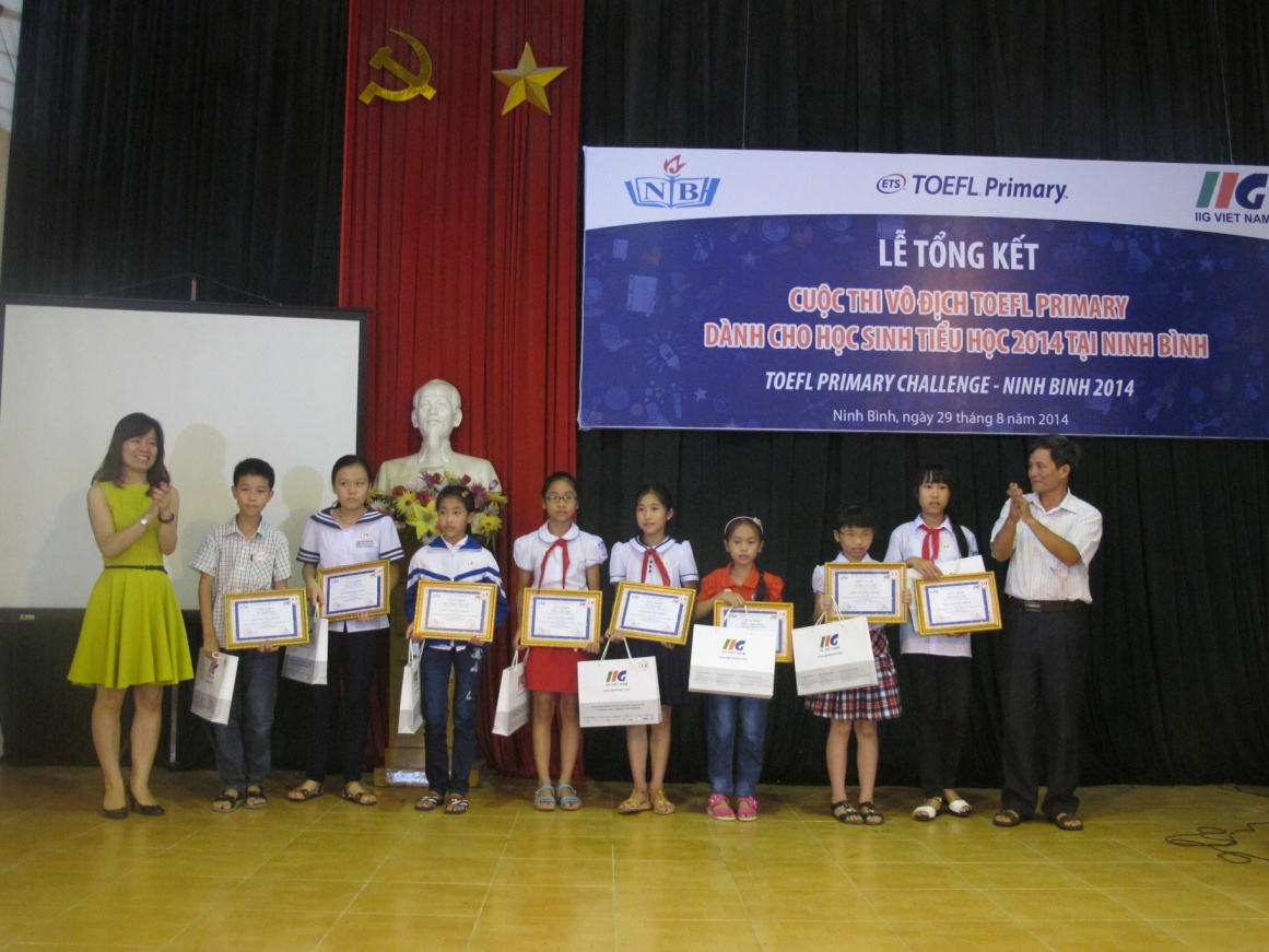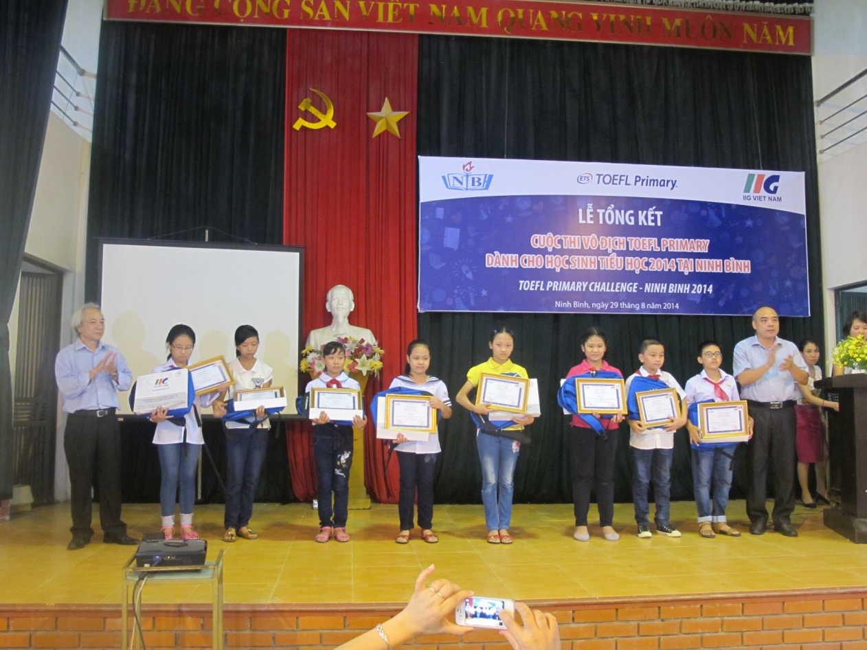 Ninh Bình, ngày 29/08/2014, Lễ vinh danh những thí sinh xuất sắc nhất cuộc thi Vô địch TOEFL Primary 2014 tại Ninh Bình đã diễn ra với sự tham gia của Sở GD&ĐT Ninh Bình, đại diện Ban giám hiệu các trường Tiểu học và các học sinh giỏi tiếng Anh trên địa bàn Tỉnh. Đây là cuộc thi tiếng Anh đầu tiên tại Việt Nam dành cho học sinh Tiểu học có sử dụng bài thi chuẩn quốc tế chuyên biệt để đánh giá trình độ thí sinh tham dự thi doIIG Việt Nam, đại diện chính thức và duy nhất của tổ chức Khảo thí Giáo dục Hoa Kỳ (ETS) tại Việt Nam, phối hợp với Sở GD&ĐT các địa phương tổ chức trên quy mô toàn quốc.