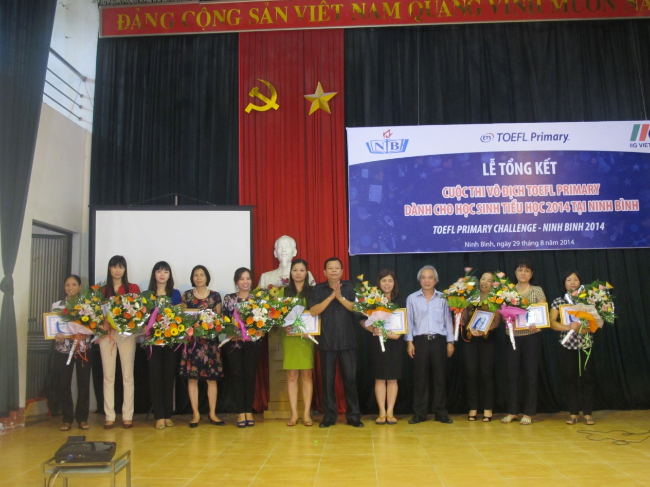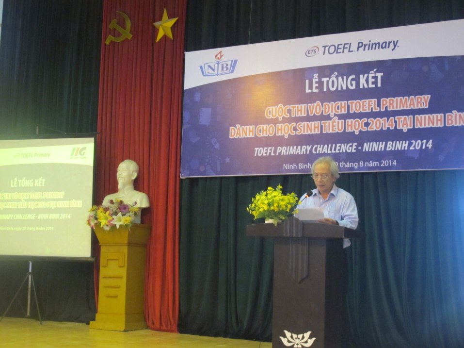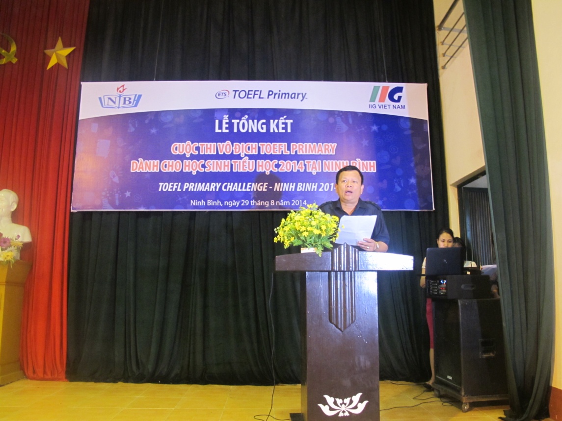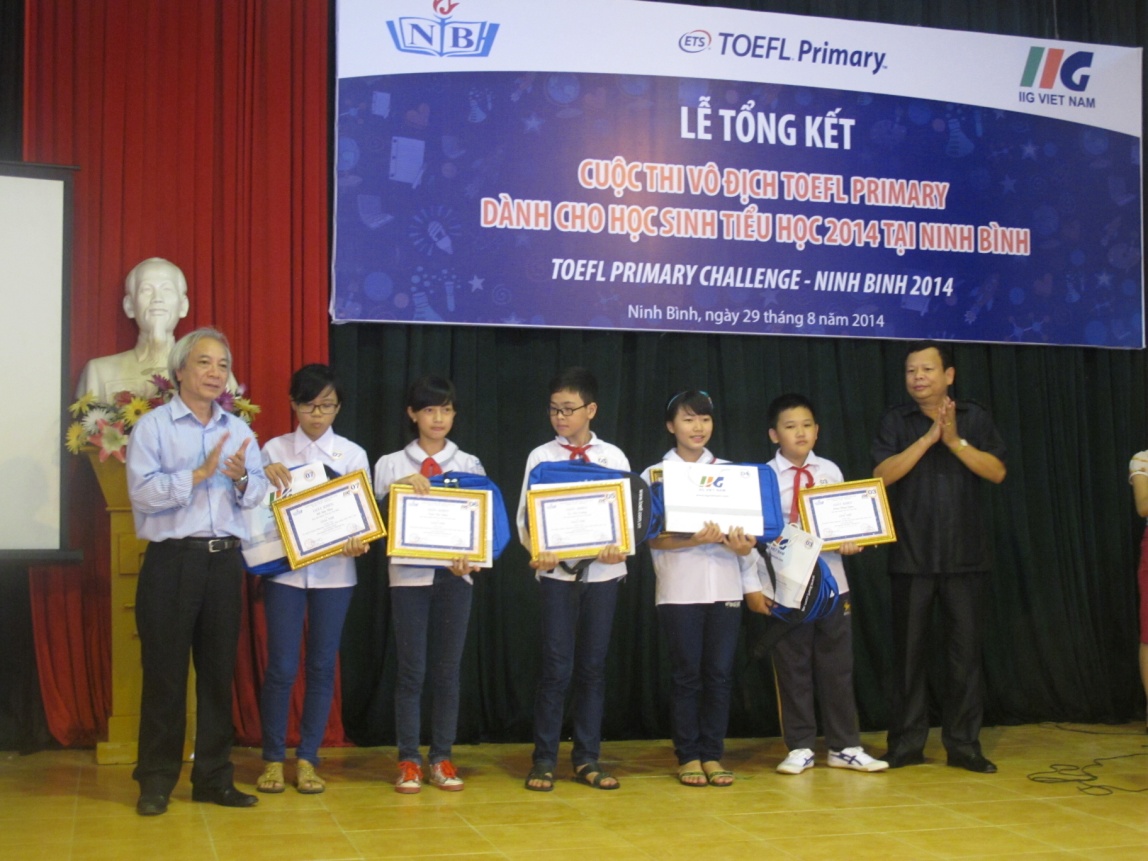 Ninh Bình, ngày 29/08/2014, Lễ vinh danh những thí sinh xuất sắc nhất cuộc thi Vô địch TOEFL Primary 2014 tại Ninh Bình đã diễn ra với sự tham gia của Sở GD&ĐT Ninh Bình, đại diện Ban giám hiệu các trường Tiểu học và các học sinh giỏi tiếng Anh trên địa bàn Tỉnh. Đây là cuộc thi tiếng Anh đầu tiên tại Việt Nam dành cho học sinh Tiểu học có sử dụng bài thi chuẩn quốc tế chuyên biệt để đánh giá trình độ thí sinh tham dự thi doIIG Việt Nam, đại diện chính thức và duy nhất của tổ chức Khảo thí Giáo dục Hoa Kỳ (ETS) tại Việt Nam, phối hợp với Sở GD&ĐT các địa phương tổ chức trên quy mô toàn quốc.