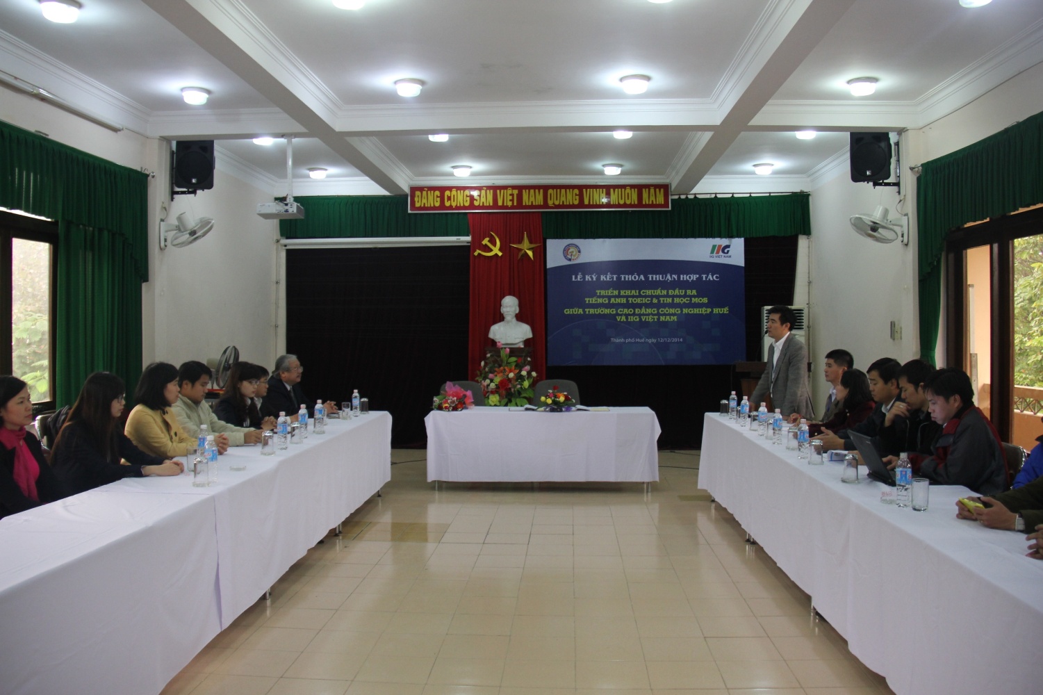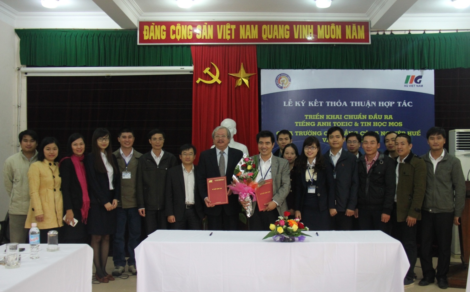 Thành phố Huế ngày 12/12/2014, Trường Cao đẳng Công nghiệp Huế và IIG Việt Nam đã ký kết Thỏa thuận Hợp tác về triển khai chuẩn đầu ra về tiếng Anh theo TOEIC và chuẩn đầu ra về Tin học văn phòng theo MOS cho cán bộ, giảng viên, sinh viên của nhà trường. Thỏa thuận Hợp tác này là bước đệm quan trọng khởi đầu quá trình áp chuẩn đầu ra về tiếng Anh và tin học cho sinh viên của Trường Cao đẳng Công nghiệp Huế từ năm học 2014-2015.