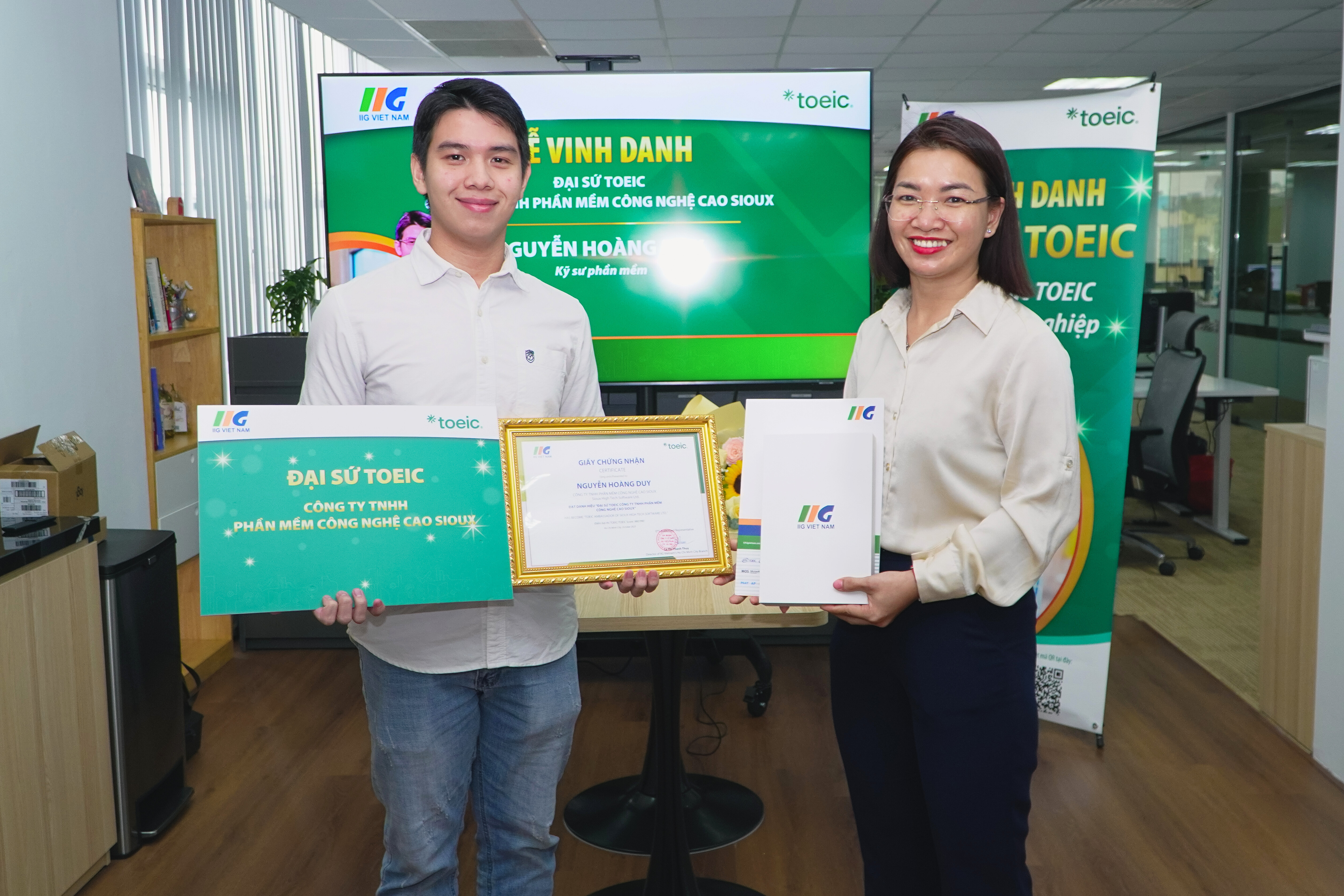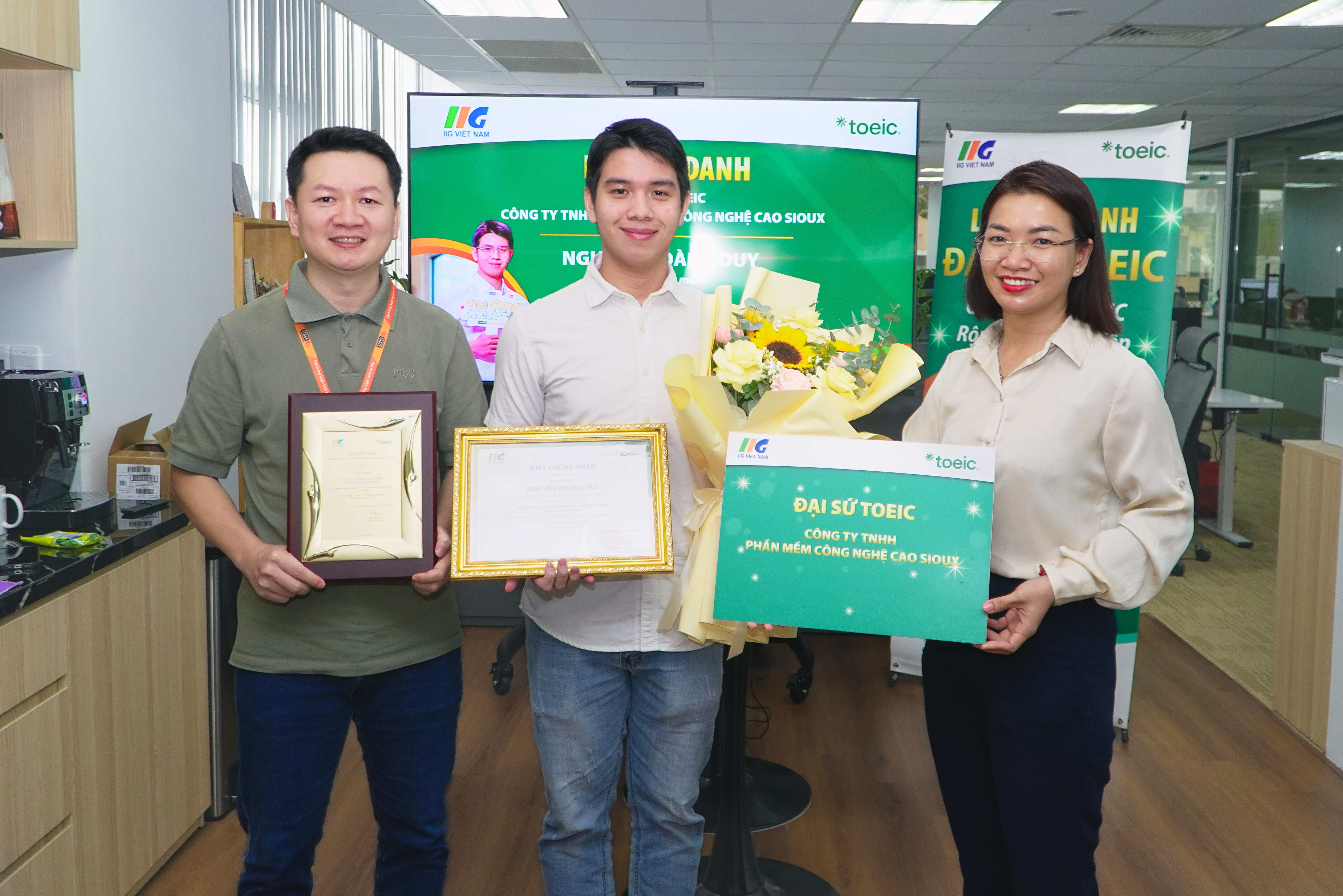 Đồng thời, anh Hiệp chia sẻ: “Với đặc thù đảm nhận nhiều dự án quốc tế, Sioux luôn đặc biệt chú trọng đến việc nâng cao năng lực tiếng Anh cho đội ngũ nhân sự. TOEIC là chứng chỉ quốc tế uy tín, phù hợp với người đi làm, đánh giá chính xác khả năng sử dụng tiếng Anh trong môi trường làm việc. Do đó, Sioux luôn khuyến khích nhân viên học tập, ôn luyện và tham gia kỳ thi TOEIC, coi đây là một trong những nhiệm vụ quan trọng trong việc phát triển năng lực hội nhập quốc tế.”