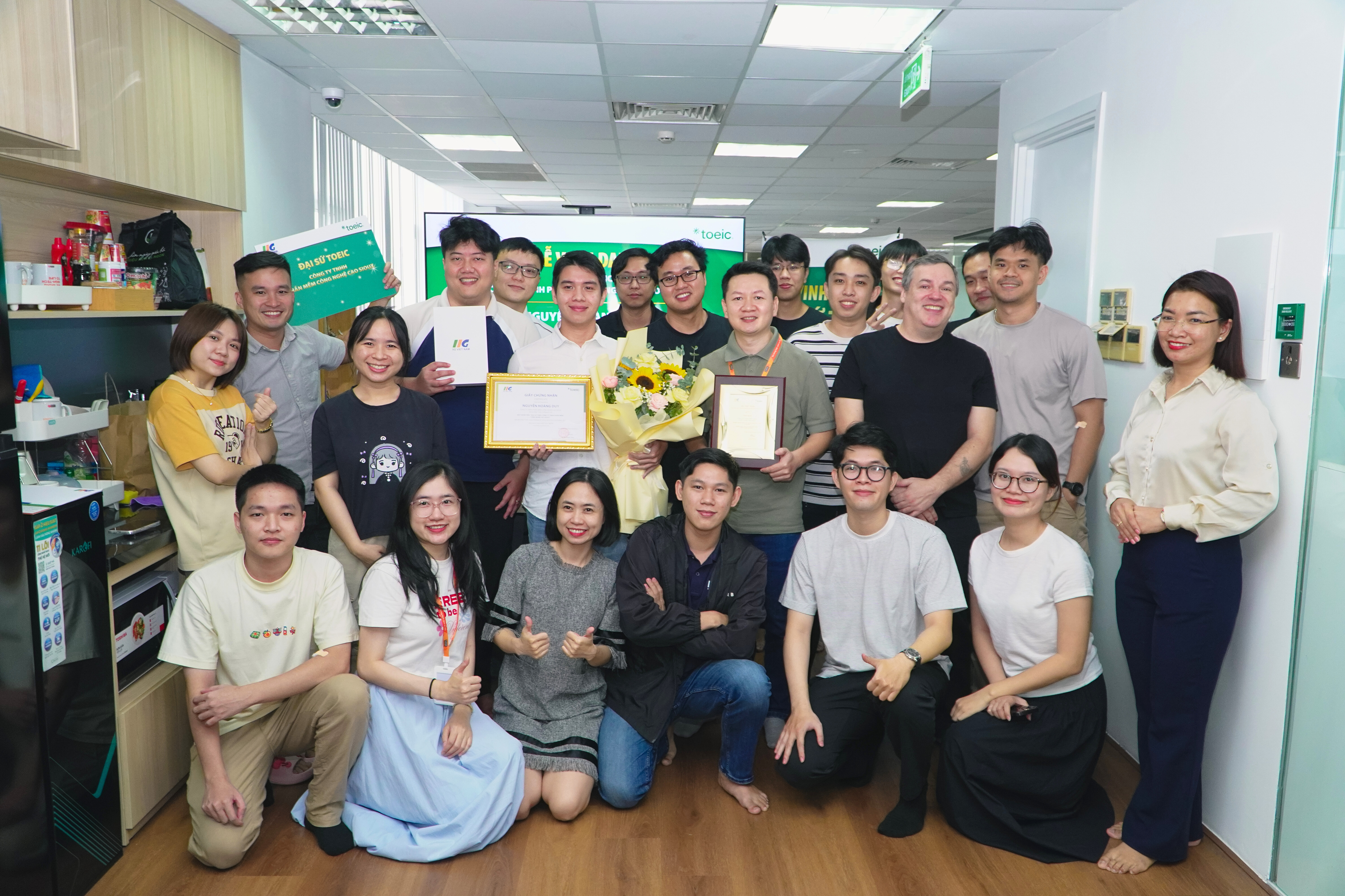 Đại diện phía công ty, anh Bùi Sỹ Hiệp – Trưởng nhóm Kỹ sư, bày tỏ niềm tự hào và gửi lời chúc mừng tới Đại sứ TOEIC Nguyễn Hoàng Duy. Anh cho biết, thành tích ấn tượng của Duy không chỉ phản ánh tinh thần cầu tiến và nỗ lực hoàn thiện bản thân mà còn truyền cảm hứng, thúc đẩy các đồng nghiệp khác trong công ty không ngừng học hỏi, hoàn thiện kỹ năng tiếng Anh.