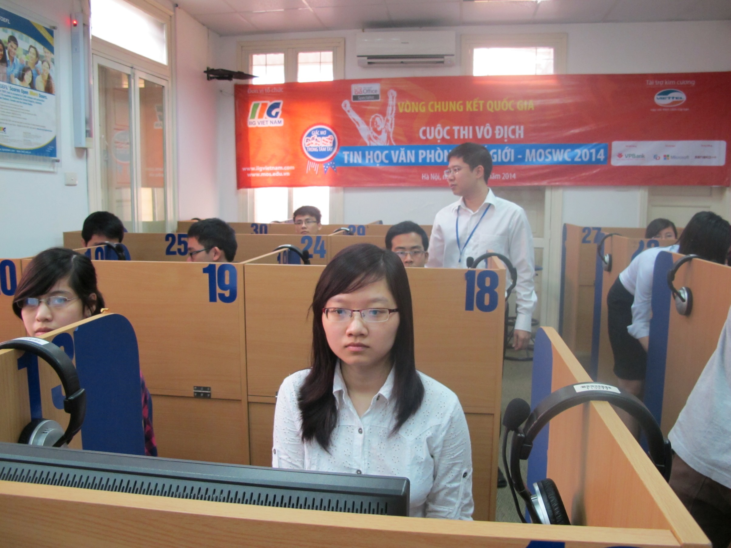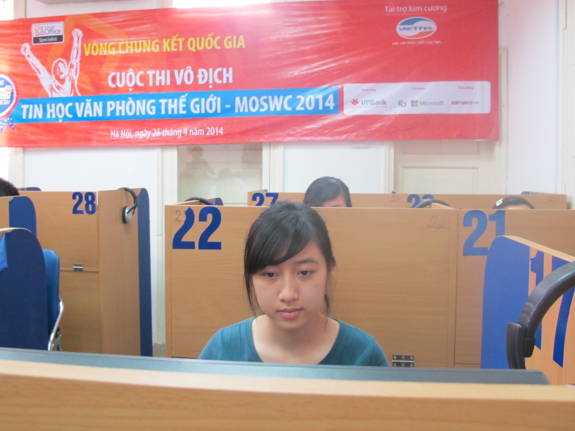 Hà Nội, ngày 29/4/2014. 90 thí sinh xuất sắc nhất được chọn ra từ hàng nghìn thí sinh đến từ 174 trường THCS, THPT và ĐH đã cùng tụ họp lại tại 2 thành phố lớn là Hà Nội và Tp. HCM để tham dự Vòng chung kết Quốc gia Cuộc thi Vô địch Tin học Văn phòng Thế giới MOSWC 2014 ngày 26/4/2014. Đây là chặng đua nước rút để tìm ra chủ nhân 3 tấm vé tham dự VCK Thế giới MOSWC 2014 tại Hoa Kỳ.